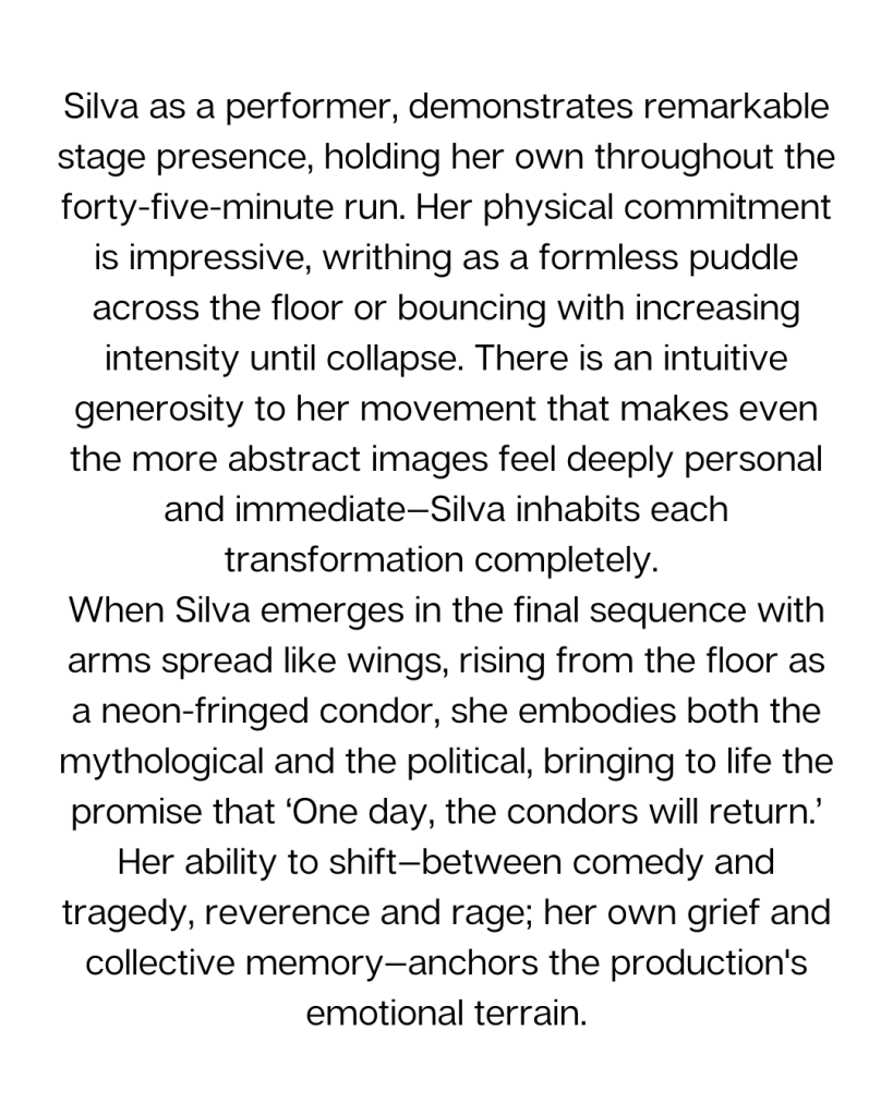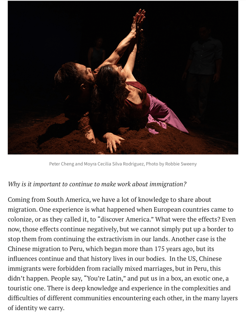“Dancer and co-artistic director of the project, Moyra Silva Rodríguez, spirals in and out of the floor, her arms like lifelines guiding each whorled pathway. She dances with signs of strength but also exhaustion, the rise and fall of a current that disrupts even the steadiest of us. Silva Rodriguez, whose Chinese-Peruvian heritage inspired the making of the piece, moves in transience, at some points getting caught in a physical coil and then sliding out to break free. “You are not Peruvian” is overheard in another interview, as historically tusán are not seen as rightful citizens of Peru, calling attention to the many lives within the country whose identities remain in fluctuation.”