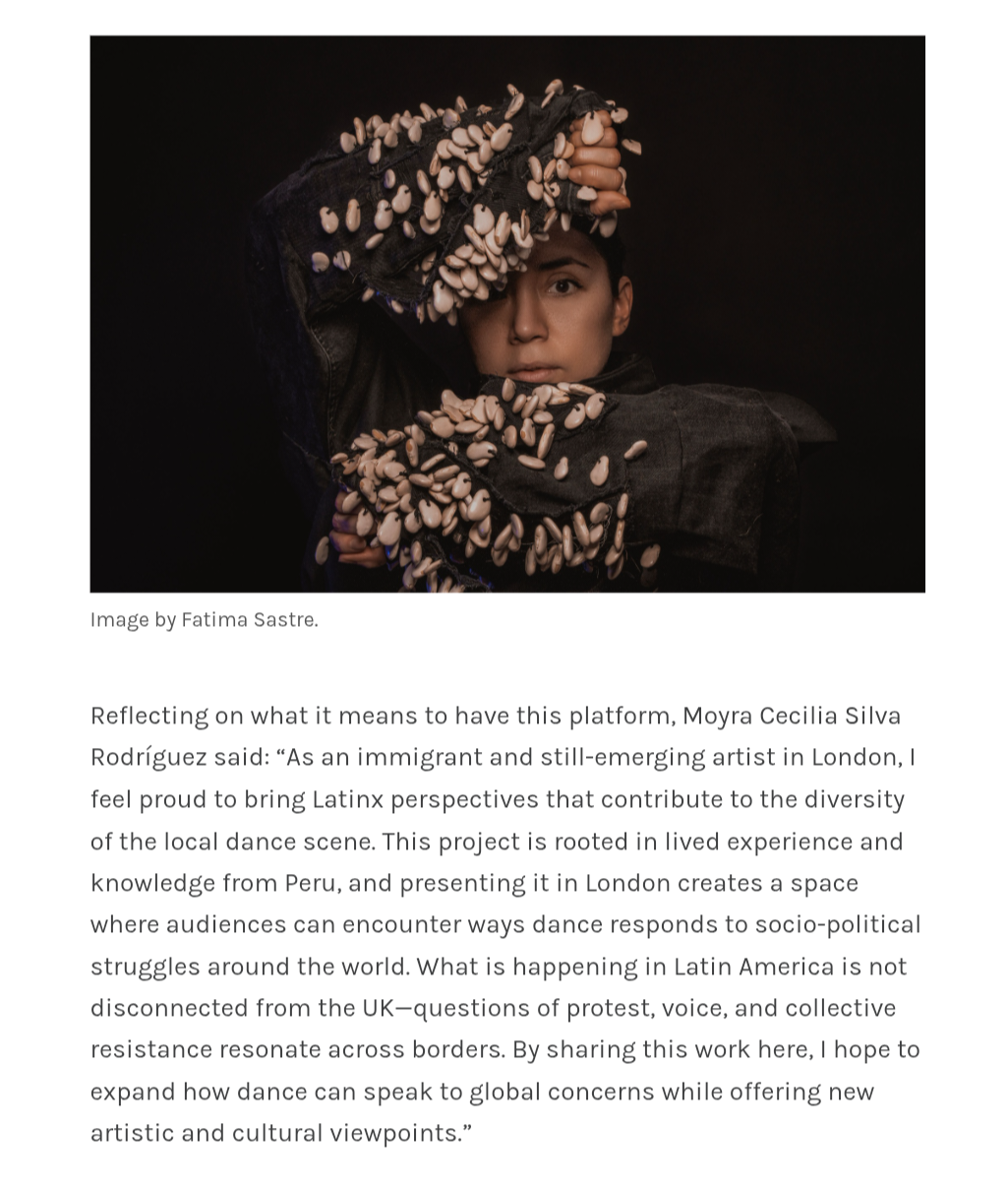 Moyra Cecilia Silva Rodriguez is a Peruvian dance artist currently based in London whose work delves into the fusion of performing and visual arts with dance anthropology. Inspired by her Chinese Peruvian ancestry, her interdisciplinary projects address themes of identity, migration, and belonging. She has recently teamed up with Lenora Lee, a choreographer based in San Francisco, to create A Bridge to Now/Un Puente hacia el Presente, a multimedia dance collaboration between US and Peruvian dancers